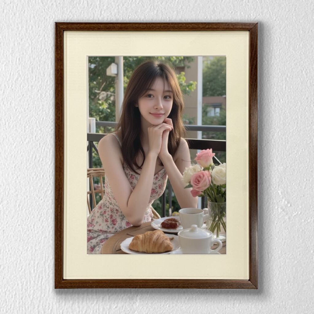 淡い花柄のワンピースと木のテーブル、バラの花が織りなす温もりある空間は、見る人の心を優しく包み込みます。リビングや寝室、カフェ風インテリアにもぴったりなアートポスターです。